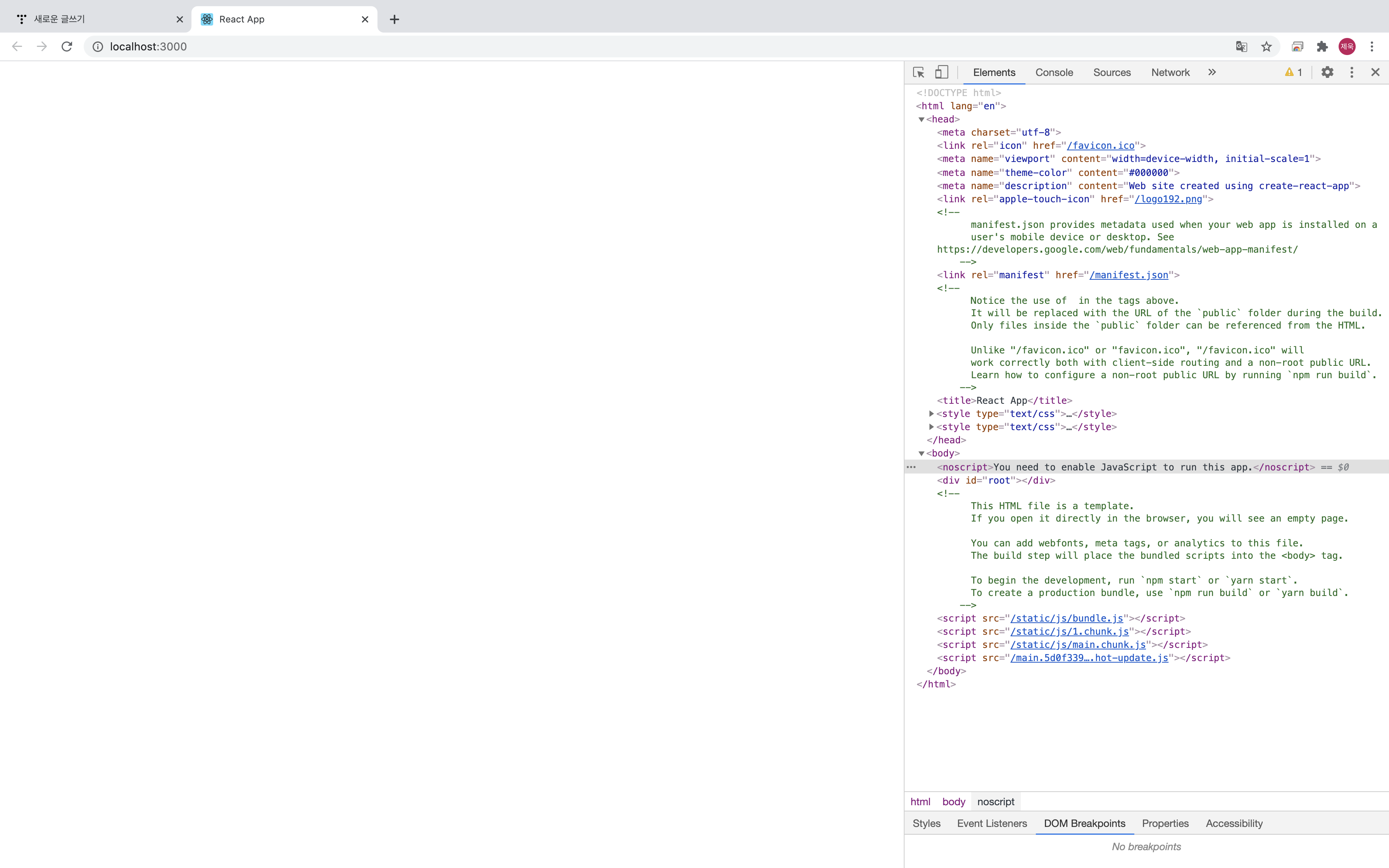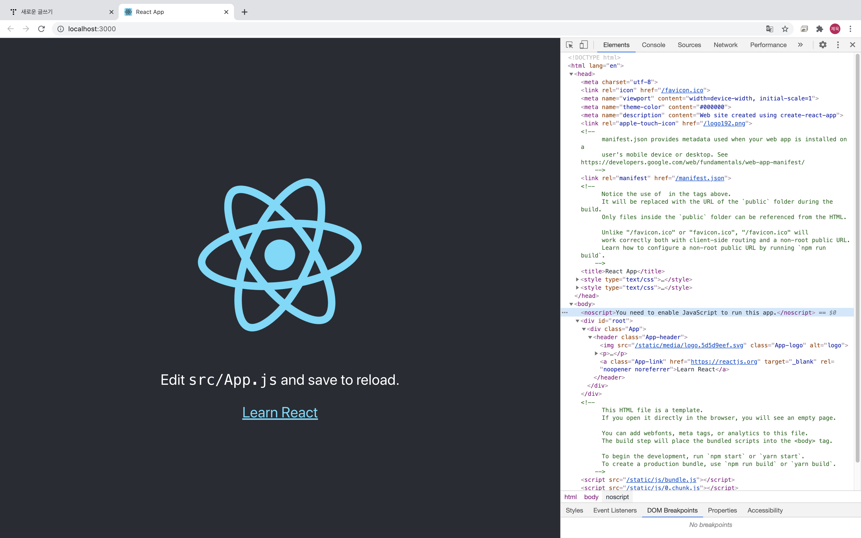 npm start 명령어가 실행 된 상태에서 http://localhost:3000 에 접속해보면 아래와 같은 화면이 뜹니다.