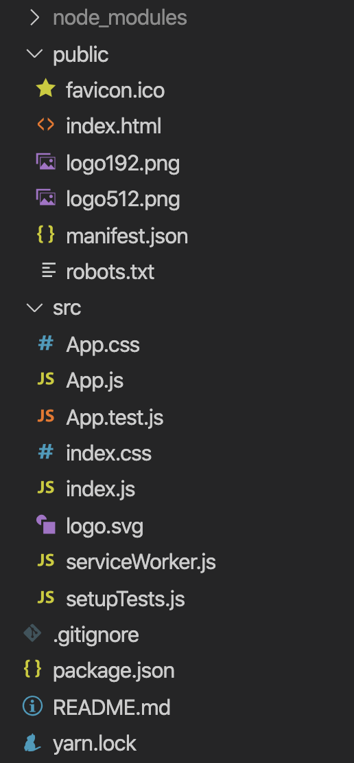 create-react-app 프로젝트명 을 입력하면 React를 사용하는데 필요한 라이브러리들과 기본 설정들이 포함된 프로젝트명 폴더가 만들어집니다.
