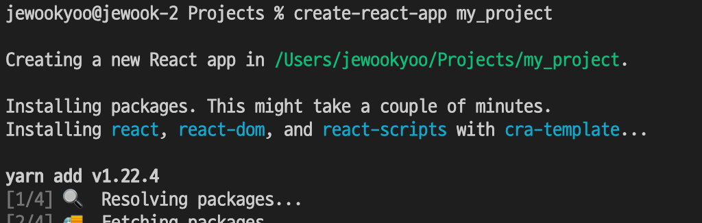 설치가 다 되었으면 React 프로젝트를 만들고 싶은 directory로 이동 후 다음 명령어로 create-react-app을 실행합니다.