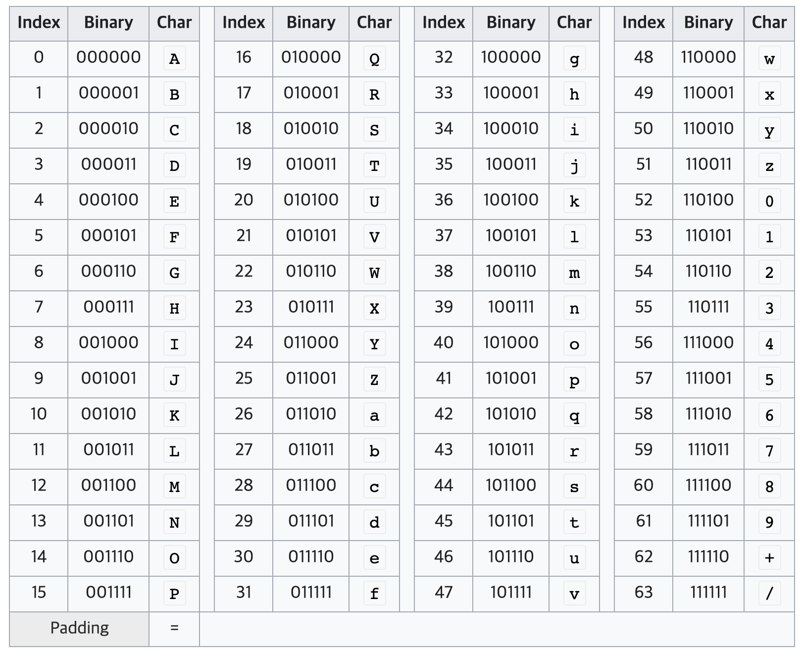 base64 인코딩 과정은 굉장히 간단합니다. 각 문자의 ascii 코드를 8비트의 이진수로 변경한 후 6비트씩 잘라서 다시 10진수로 변환합니다. 그 다음 base64 색인표에서 해당하는 문자로 변경하면 끝입니다. 8과 6의 최소 공배수는 24이므로 24비트, 즉 3글자씩 잘라서 4글자의 base64 인코딩 문자를 만들어냅니다. 6비트씩 자르기 때문에 색인표에는 0 ~ 63까지 총 64개의 값이 들어있습니다. 색인표에 따르면 Boy를 base64 인코딩 했을 때 Qm95 가 됩니다.