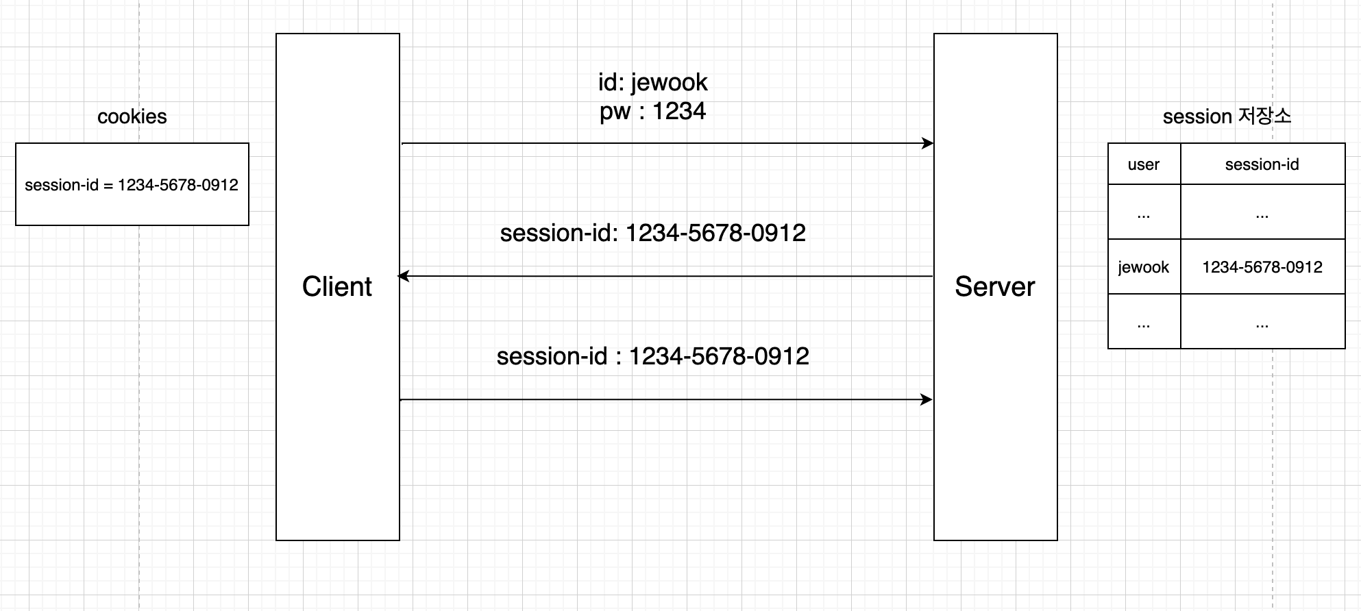 클라이언트에서 처음에 서버로 로그인 request를 보내면 서버에서는 id와 pw가 맞는지 확인 후 session 저장소에 session-id라고 불리는 사용자의 임시 id를 만듭니다. 그리고 response로 그 session-id를 보내줍니다. 클라이언트는 그 session-id를 브라우저의 쿠키로 저장해놓고 다음 request에 해당 session-id를 같이 보냅니다. 그러면 서버에서는 session 저장소에서 request에 들어있는 session-id가 어떤 사용자의 session-id인지 찾습니다. session-id의 주인을 찾고 나면 해당 request가 "jewook"이라는 사용자로부터 온 request라는 것을 알 수 있습니다. 사용자가 로그아웃을 하게되면 session-id는 삭제되고 다음 로그인 시 또 다른 session-id가 생성됩니다.