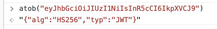 header는 base64Url 인코딩 된 문자열인데 - 와 _ 가 포함되어 있지 않으니 base64 인코딩 한 결과값과 같습니다. 따라서 base64 디코딩을 해주는 atob() 함수를 통해 원래 어떤 문자열이었는지 확인할 수 있습니다.