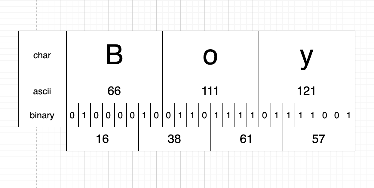 base64 인코딩은 이진수를 text로 변환해주는 기법입니다. 아래 그림을 통해 Boy라는 string을 base64 인코딩 하는 과정을 살펴보겠습니다.