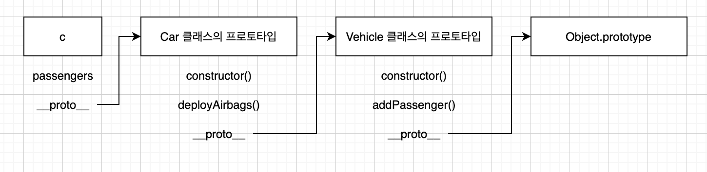 그럼 c.addPassenger() 메서드를 호출할 때 어떤 일들이 일어나는지 알아보겠습니다. c.addPassenger() 메서드를 호출하면 우선 인스턴스 c 내부에 addPassenger() 메서드가 있는지 찾습니다. 인스턴스 c 내부에는 addPassenger() 메서드가 없기 때문에 c.__proto__ 에서 addPassenger() 메서드를 찾습니다. Car 클래스의 프로토타입인 c.__proto__ 내부에도 addPassenger() 메서드가 없기 때문에 c.__proto__.__proto__ 내부에서 addPassenger() 메서드를 찾습니다. Vehicle 클래스의 프로토타입인 c.__proto__.__proto__ 내부에는 addPassenger() 메서드가 있기 때문에 addPassenger() 메서드를 실행합니다. 이렇게 프로토타입 체인을 타고 상위 프로토타입으로 거슬러 올라가며 메서드를 찾기 때문에 Car 클래스의 인스턴스인 c에서 Vehicle 클래스의 메서드를 사용할 수 있게 된 것입니다.