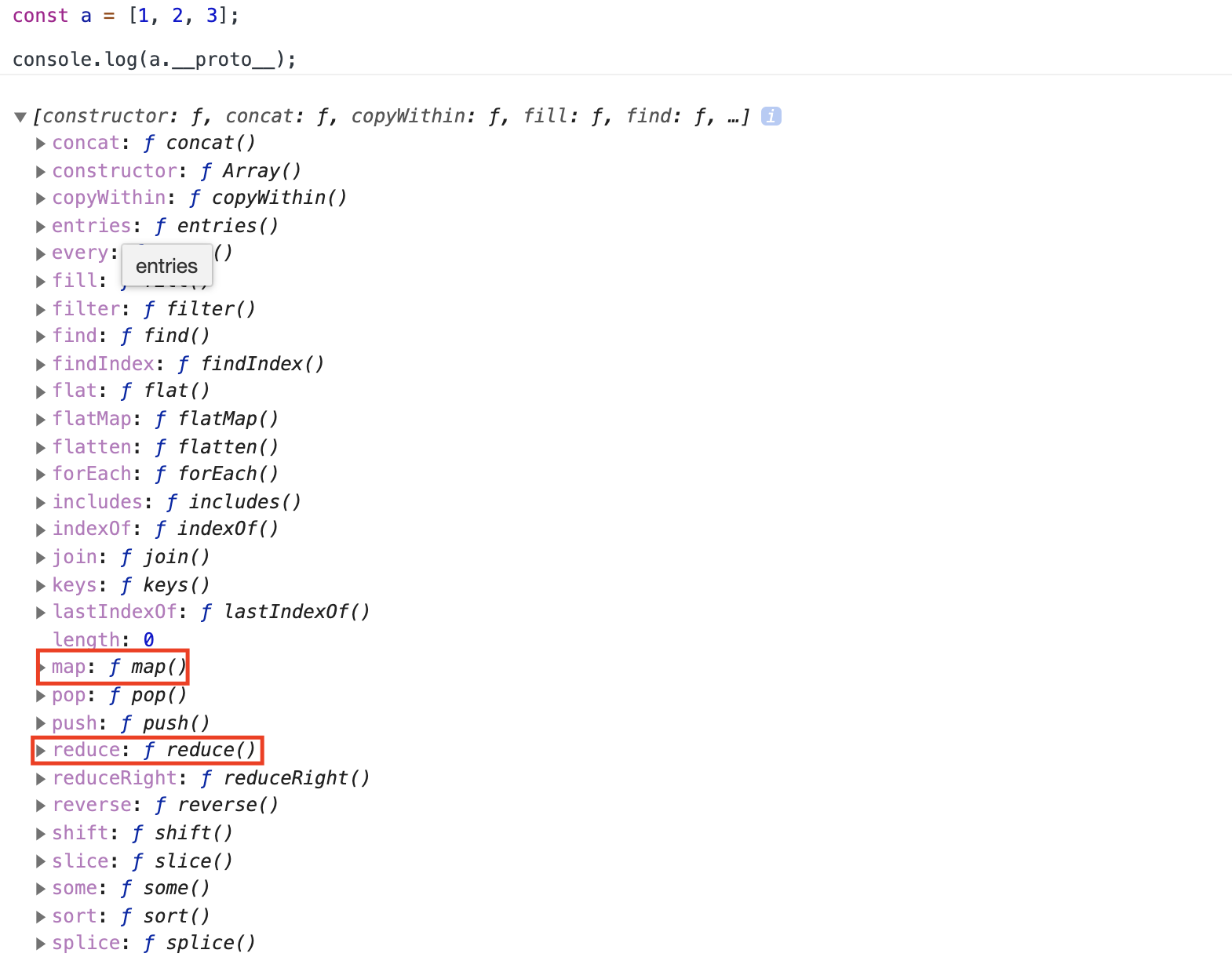 우리가 배열을 선언하고 map, reduce 같은 array 메서드들을 따로 정의하지 않아도 사용할 수 있는 것도 프로토타입 체인 덕분입니다. 모든 배열은 Array.prototype을 프로토타입으로 가지고 있고 map, reduce 같은 array 메서드들은 Array.prototype에 정의되어 있기 때문에 모든 배열에서 array method 들을 사용할 수 있습니다.
