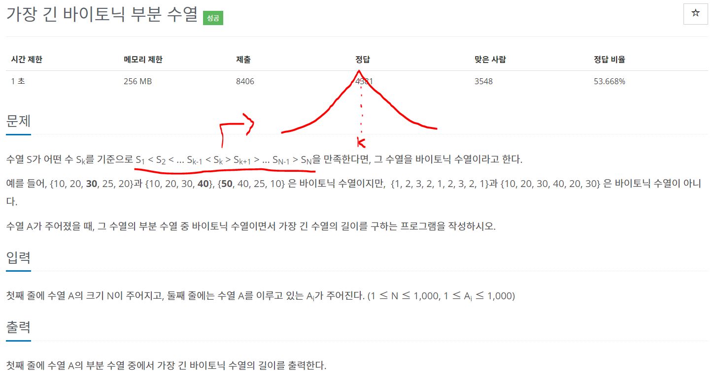 즉, 사진에 표시해 놓은 것 처럼 k를 꼭지점으로 하고 시작지점에서부터 k까지는 증가수열, k부터 끝지점까지는 감소수열 형태인것입니다.