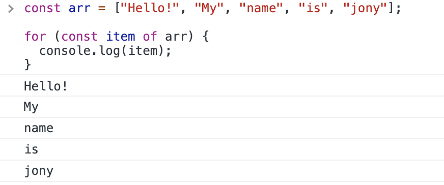 위 코드는 for of 문을 이용해 배열의 원소를 출력하는 코드입니다. for of 문에 배열이 사용될 수 있는 이유는 배열이 iterable 객체이기 때문입니다.