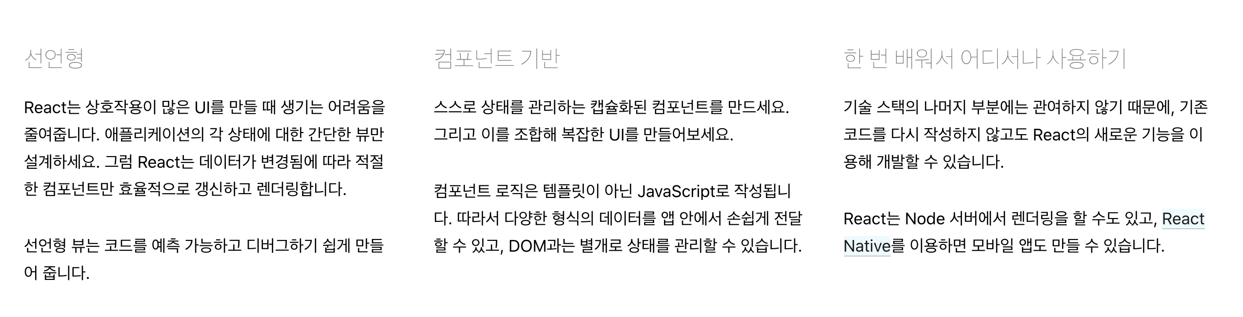 react 공식 홈페이지(https://ko.reactjs.org/) 에 가보니 react를 이렇게 설명합니다.